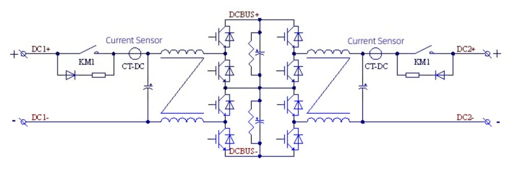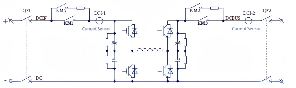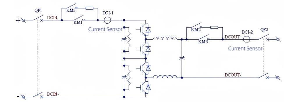 The bidirectional DCDC converter adopts the classic BUCK/BOOST step-up/step-down chopper circuit topology,with bidirectional transformation function for voltage step-up/step-down, enabling energy to flow in both directions. 。With advanced interleaved control technology, it features low ripple current and high output power quality. For DC voltage: DC≤1200V, a two-level circuit topology is adopted; for DC voltage: 1200V<DC≤1500V, a three-level circuit topology is adopted.