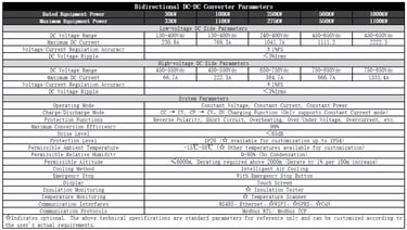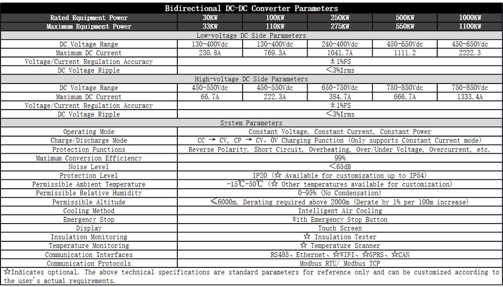 Bidirectional DCDC Converter with Constant Voltage, Constant Current, and Constant Power Operation Modes, Supporting Parallel Operation. Touchscreen serves as the Human-Machine Interface, integrating display and control functions. Real-time display of operation data, status information, and fault information, with historical fault information query function (capable of storing 200,000 records). Optional DC energy meter provides accurate DC energy statistics (accuracy class 0.2).