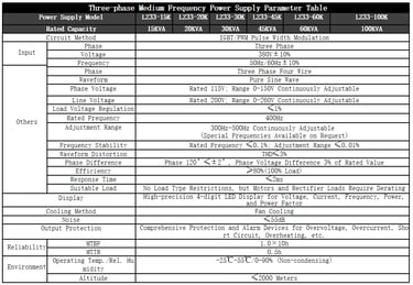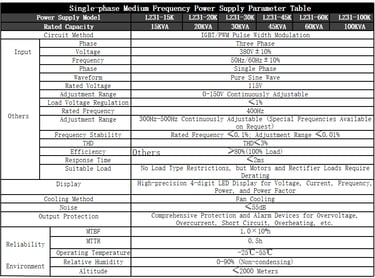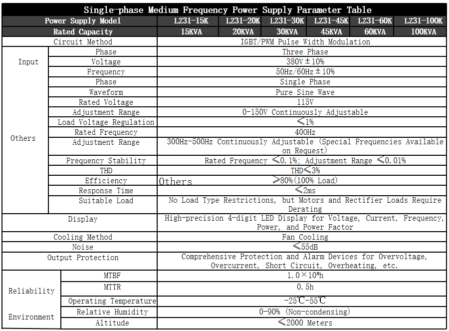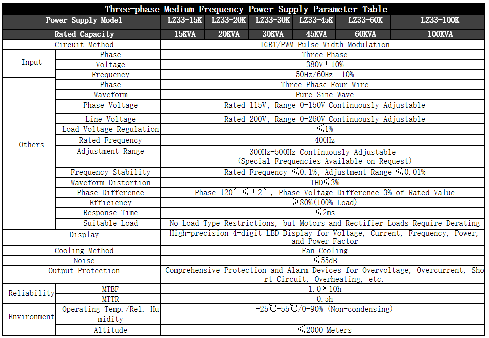 The LZ Series 400Hz Medium-Frequency Power Supply mainly functions as a power source that converts municipal electricity into the required voltage and frequency for aviation and military purposes through power conversion circuits. Its main characteristics include providing clean and reliable sinusoidal power output, low harmonic distortion, and high stability in frequency and voltage regulation for aviation and military applications.