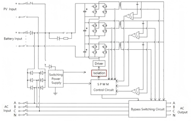 The off-grid inverter adopts SPWM (Sine Pulse Width Modulation) technology, which converts high-voltage DC into pulse sequences with gradually varying pulse widths by controlling the switching timing of IGBT modules. After filtering and shaping through the filter circuit to remove high-frequency harmonics, the voltage pulse sequence is transformed into smooth sinusoidal AC power. The power quality meets the grid standard and is suitable for all types of loads.