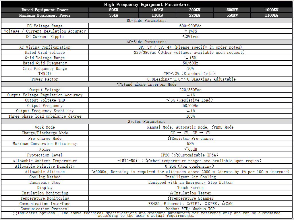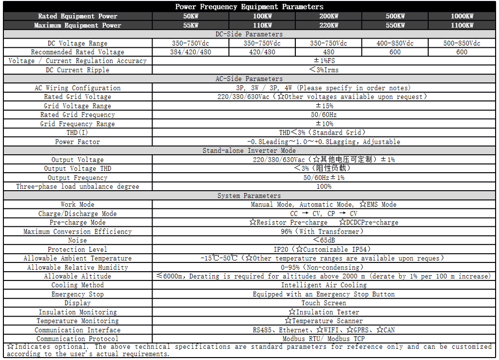 Four-quadrant operation with bi-directional energy flow and adaptive grid frequency (50/60Hz).