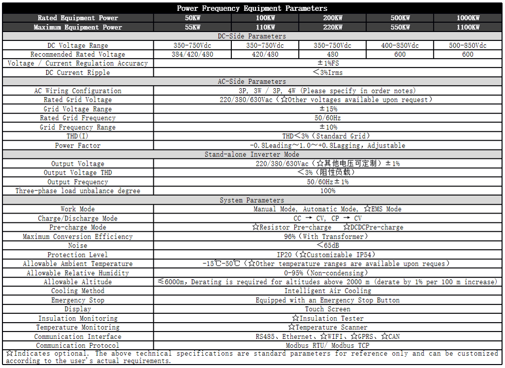 Four-quadrant operation with bi-directional energy flow and adaptive grid frequency (50/60Hz).