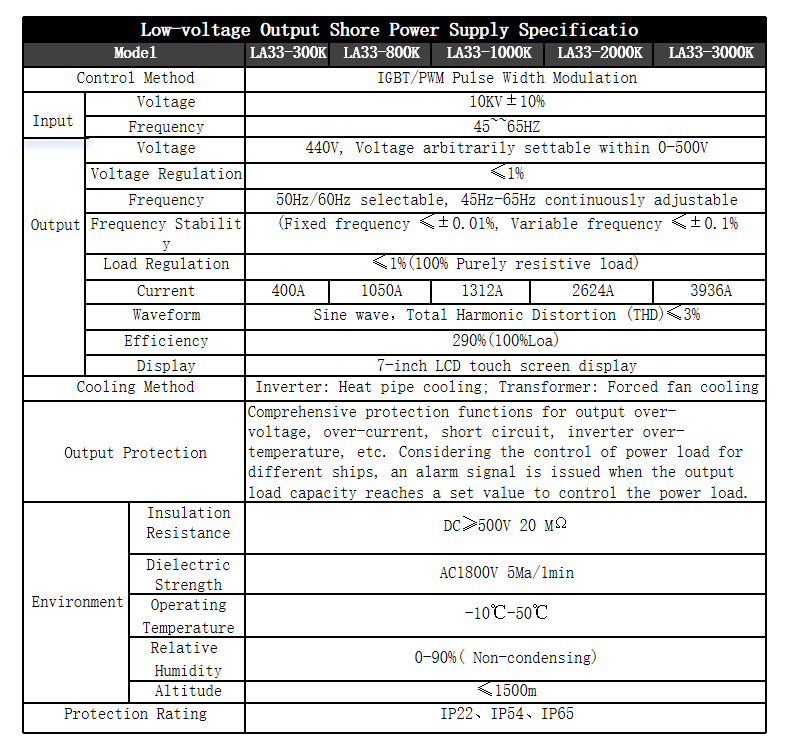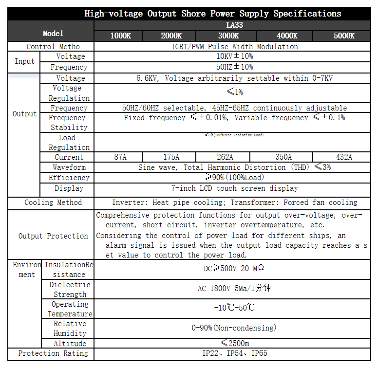 The LA series high-power shore power supply is a specially designed and manufactured 60Hz variable frequency power supply equipment developed by our company according to customer needs, specifically for harsh industrial environments such as high temperature, high humidity, high corrosiveness, and heavy load impact. Our existing mature products can reach up to 3000KVA in single unit power. It complies with China Classification Society (CCS) marine product certification standards and is widely used in applications such as on-board ships, shipbuilding and repair, offshore drilling platforms, and shore terminals for powering marine electrical equipment. With its strong research and manufacturing capabilities, Longrui has become a supplier to many large well-known shipyards and port machinery manufacturers in China.