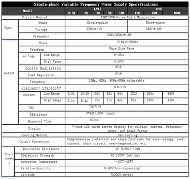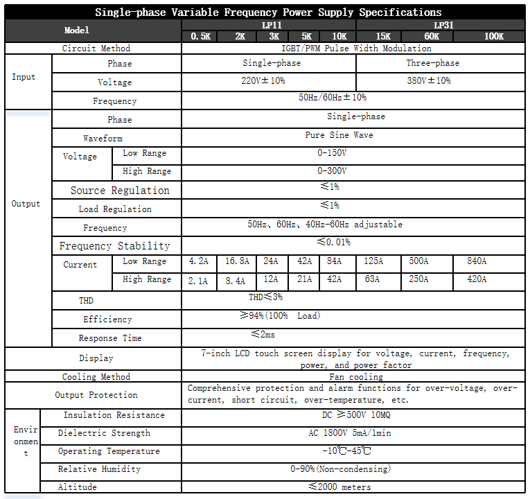 The LP series variable frequency power supply is a power source that converts mains electricity into required voltage and frequency through power conversion circuits. Its main features include providing clean and reliable sine wave power output, low harmonic distortion, and high stability in frequency and voltage regulation. It can simulate output characteristics of different voltages and frequencies worldwide, covering all industrial needs, and fully meets the requirements of engineers in design and development, production line testing, product quality inspection, life testing, over-voltage/under-voltage simulation testing, and power supply for imported equipment and production lines.