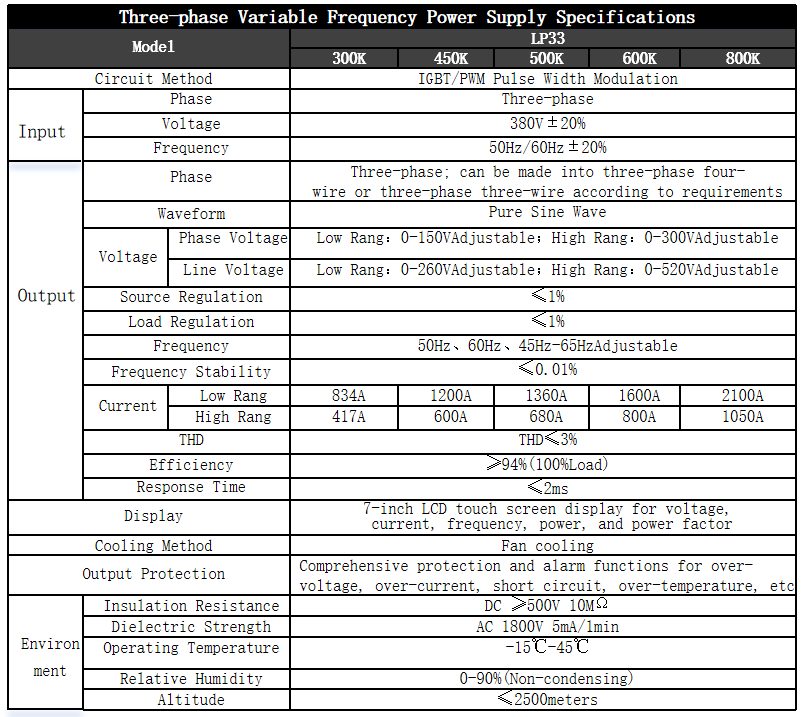 Our LP series variable frequency power supply, with microprocessor as its core, adopts PWM method and sinusoidal pulse width modulation technology. The single machine capacity ranges from 500VA to 1000KVA, and the output can simulate different voltages and frequencies from various regions worldwide, meeting the load requirements of various industries. The power supply features isolated transformer output, ensuring safety and reliability while enhancing overall system stability. It has characteristics such as strong load adaptability, high-quality output waveform, simple operation, small size, and light weight. With comprehensive protection functions including short circuit, overcurrent, overvoltage, and overheating protection, it guarantees reliable operation of the power supply.