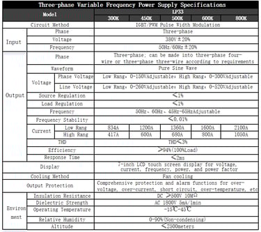 The LP series variable frequency power supply is mainly designed to convert mains power into required voltage and frequency through power conversion circuits. Its main features include providing clean and reliable sinusoidal power output, low harmonic distortion, and high stability in frequency and voltage regulation. It can simulate output characteristics of different voltages and frequencies worldwide, covering all industrial needs, and fully meets the requirements of engineers in design and development, production line testing, product quality inspection, life testing, over-voltage/under-voltage simulation testing, and power supply for imported equipment and production lines.